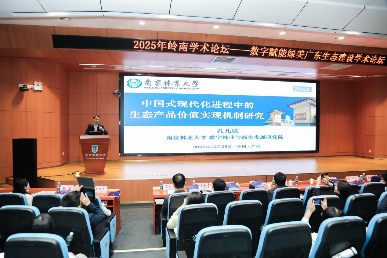 2025年10月28日,由广东省社会科学界联合会主办,广东财经大学、广东省数字经济学会承办的2025年岭南学术论坛——数字赋能绿美广东生态建设学术论坛在广州财经大学顺利召开,来自生态环境部环境与经济政策研究中心、自然资源部南海发展研究院、北京大学、中国人民大学、暨南大学、北京工业大学、华南师范大学、贵州大学、南京林业大学、南京审计大学、广东财经大学、广东海洋大学、浙江农林大学、澳门科技大学、上海应用技术大学等高校和科研院所的100余位专家学者和研究生参会。孔凡斌教授应邀参加并作主旨报告。