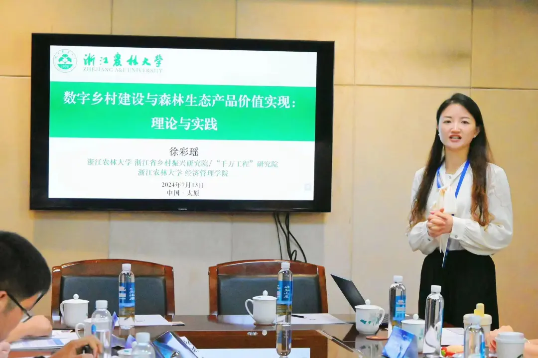 徐彩瑶副教授作了题为《数字乡村建设与森林生态产品价值实现:理论与实践》的报告。在报告中,徐彩瑶副教授指出,党的二十大报告提出实现人与自然和谐共生与全体人民共同富裕是中国式现代化的历史使命,提出要建立生态产品价值实现机制,作为推进乡村全面振兴和实现共同富裕的重要举措。数字乡村建设既是全面推进乡村振兴战略的重要方向,又是释放数字红利催生乡村发展内生动力的重要举措,数字乡村建设促进森林生态产品价值实现或是有效破解森林资源"诅咒"困境进而推动农村共同富裕进程的重要机遇。理论上,数字乡村建设促进森林生态产品价值实现将通过数据要素赋能、技术要素赋能和治理要素赋能,助力林业技术创新、产业提质、治理增效,助推森林生态产业化的迭代升级,加快森林生态产品价值实现。实践之中,数字乡村建设通过数据赋能、技术赋能和治理赋能,创新解决森林生态资源资产化环节的森林生态产品调查监测难、森林生态资产资本化环节的价值核算难、以及森林生态资本资金化环节的经营开发难和交易变现难等问题,助力提高森林生态资源资产化、资本化和资金化水平,进而推动森林生态产品生态链、产业链和价值链持续攀升。